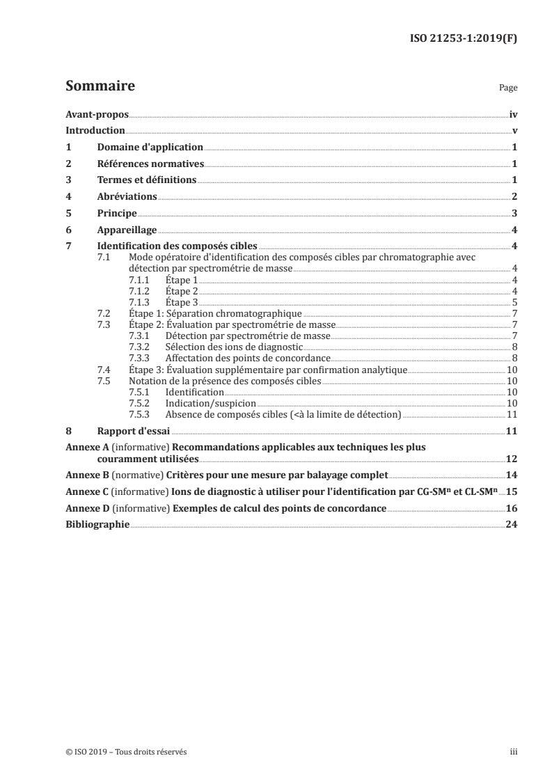 - See Annexes A–D of ISO 21253‑1 for technique recommendations, full‑scan criteria, diagnostic ions and examples of identification‑point calculations.