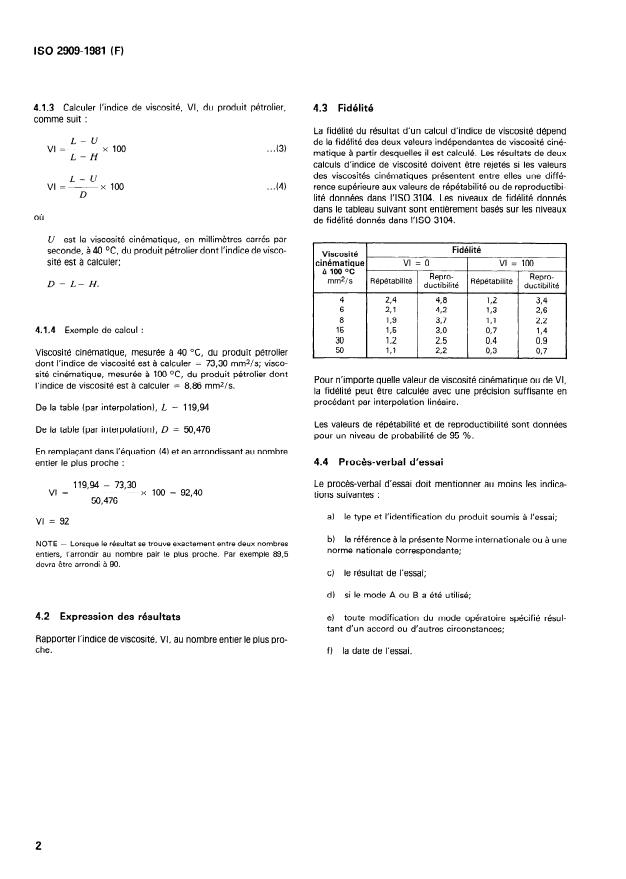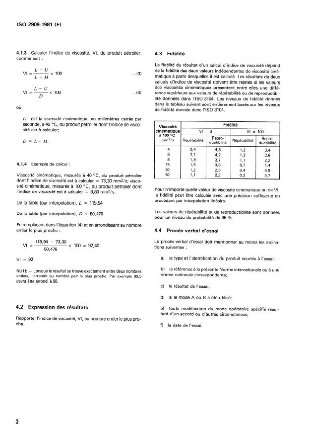 INTERNATIONAL STANDARD ISO 2909-1981 (E) Petroleum products - Calculation of viscosity index from kinematic viscosity 1 Scope and field of application 1 .l This International Standard specifies two procedures for calculating the viscosity index of Petroleum products and related materials from their kinematic viscosities at 40 OC and 100 OC * : - Procedure A is applicable to Petroleum products of viscosity index up to and including 100; - Procedure B is applicable to Petroleum products of viscosity index 100 or greater. 1.2 The table given in this International Standard applies to Petroleum products with kinematic viscosities between 2 and 70 mmV8 at 100 OC **. Equations are provided for calculating viscosity index for Petroleum products having kinematic viscosities above 70 mm2/s at 100 OC. 1.3 The kinematic viscosity values are determined with reference to a value of 1,003 8 mm2/s at 20,OO OC for distilled water. The determination of the kinematic viscosity of a Petroleum product shall be carried out in accordance with ISO 3104. 2 Reference ISO 3104, Petroleum products - Transparent and opaque liquids - Determination of kinema tic viscosity and calcula tion of dynamic viscosity. 3 Definition viscosity index (VI) : A number on a conventional scale used to characterize the Variation of the viscosity of a Petroleum product with temperature. A high viscosity index indicates a relatively small Change of viscosity with temperature and vice versa. 4 Procedure A (For Petroleum products of viscosity index up to and including 100.1 4.1 Calculation 4.1.1 If the kinematic viscosity of the Petroleum product at 100 OC is less than or equal to 70 mm%, extract from the table the corresponding values for L and D. Measured values which are not Iisted, but which are within the range of the table, may be obtained by linear interpolation. 4.1.2 If the kinematic viscosity is above 70 mm2/s at 100 OC, calculate the values of L and D as follows : L = 0,835 3 Y2 + 14,67 Y - 216 . .(I) D = 0,666 9 Y2 + 2,82 Y - 119 . . . (2) where L is the kinematic viscosity, in Square millimetres per second, at 40 OC of a Petroleum product of viscosity index 0 having the same kinematic viscosity at 100 OC as the petro- leum product whose viscosity index is to be calculated; Y is the kinematic viscosity, in Square millimetres per second, at 100 OC of the Petroleum product whose viscosity index is to be calculated; D=L-H; H being the kinematic viscosity, in Square millimetres per second, at 40 OC of a Petroleum product of viscosity index 100 having the same kinematic viscosity at 100 OC as the Petroleum product whose viscosity index is to be calculated. * The results obtained from the calculation of VI from kinematic viscosities determined at 40 OC and 100 OC are virtually the same as those obtained from the former VI System using kinematic viscosities determined at 37,78 OC and 98,89 OC. ** In this International Standard, kinematic viscosity is expressed in Square millimetres per second (mm%), which is a recommended sub-multiple of the SI unit (m2/s) for this quantity. In practice, however, the centistoke (cSt) is generally used in this case in the Petroleum and petrochemical in- dustries. The values of the kinematic viscosity are unaffected by this practice in view of the fact that 1 cSt = 1 mmz/s. SIST ISO 2909:1996