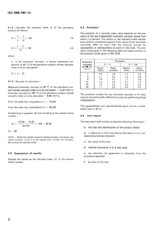 ISO 2909-1981 (El 4.1.3 Calculate the viscosity index VI of the Petroleum product as follows : L-U VI = --~ x 100 . * . L-H (3) L-U VI =- x 100 . . . (4) D where U is the kinematic viscosity, in Square millimetres per second, at 40 OC of the Petroleum product whose viscosity index is to be calculated; D=L-H. 4.1.4 Example of calculation : Measured kinematic viscosity at 40 OC of the Petroleum pro- duct whose viscosity index is to be calculated = 73,30 mm2/s; kinematic viscosity at 100 OC of the Petroleum product whose viscosity index is to be calculated = 8,86 mm2/s. From the table (by interpolation) L = 119,94 From the table (by interpolation) D = 50,476 Substituting in equation (4) and rounding to the nearest whole number : VI = 119,94 - 73,30 x 100 = 92,40 50,476 VI = 92 NOTE - When the number is exactly halfway between the nearest two whole numbers, round it to the nearest even number. For example, 89,5 should be reported as 90. 4.2 Expression of results Express the results as the viscosity index, VI, to the nearest whole number. 4.3 Precision The precision of a viscosity index value depends on the pre- cision of the two independent kinematic viscosity values from which it is derived. The results of two viscosity index calcula- tions shall be considered suspect if the values of the kinematic viscosities differ by more than the amounts quoted for repeatability or reproducibility as given in ISO 3104. The pre- cision levels given in the following table are based entirely on the precision levels given in ISO 3104. Kinematic . viscosity VI = 0 Precision VI = 100 at 100 OC mm?s I Repeat- Repro- Repeat- Repro- ability ducibility ability ducibility 4 2,4 4,8 L7 3,4 6 Zl 42 L3 Z6 8 119 3,7 IJ 22 15 L5 3,o 0,7 114 30 12 2,5 0,4 03 50 LJ 22 0,3 0,7 . The precision number for any kinematic viscosity or VI value may be calculated with sufficient accuracy by performing linear interpolations. The repeatabilities and reproducibilities given are for a prob- ability level or 95 %. 4.4 Test report The test report shall contain at least the foliowing information : a) the type and identification of the product tested; b) a reference to this International Standard or to a cor- responding national Standard; c) the result of the test; d) whether procedure A or B was used; e) any deviation, by agreement or otherwise, from the procedure specified; f) the date of the test. SIST ISO 2909:1996