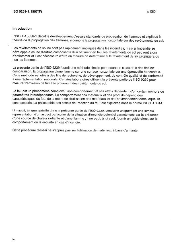 ISO 9239-1:1997 is a standard published by the International Organization for Standardization (ISO). Its full title is "Reaction to fire tests — Horizontal surface spread of flame on floor-covering systems — Part 1: Flame spread using a radiant heat ignition source". This standard covers: Reaction to fire tests — Horizontal surface spread of flame on floor-covering systems — Part 1: Flame spread using a radiant heat ignition source