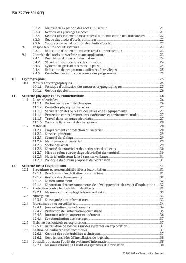 L'ISO 27799 :2016 donne des lignes directrices en matière de normes organisationnelles relatives à la sécurité de l'information et des bonnes pratiques de management de la sécurité de l'information, incluant la sélection, la mise en ?uvre et la gestion de mesures de sécurité prenant en compte le ou les environnement(s) à risques pour la sécurité de l'information de l'organisme. Elle spécifie des lignes directrices permettant d'interpréter et de mettre en ?uvre l'ISO/IEC 27002 dans le domaine de l'informatique de santé et constitue un complément à cette dernière. L'ISO 27799 :2016 fournit des préconisations de mise en ?uvre des mesures décrites dans l'ISO/IEC 27002 et les complète, le cas échéant, de façon à ce qu'elles puissent être utilisées efficacement dans le mangement de la sécurité des informations de santé. La mise en ?uvre de l'ISO 27799 :2016 permettra aux organismes de santé et aux autres dépositaires d'informations de santé de garantir le niveau minimal requis de sécurité approprié aux conditions de leur organisme et de protéger la confidentialité, l'intégrité et la disponibilité des informations personnelles de santé dans leurs activités de soins. L'ISO 27799 :2016 s'applique à tous les aspects des informations de santé, quelle que soit la forme (mots, chiffres, enregistrements sonores, dessins, vidéos et images médicales), le support utilisé pour les stocker (imprimés, documents manuscrits ou stockage électronique) ou les moyens mis en ?uvre pour leur transmission (en main propre, par fax, par réseau informatique ou par courrier), de sorte que l'information soit toujours correctement protégée. L'ISO 27799 :2016 et l'ISO/IEC 27002 définissent les exigences en termes de sécurité de l'information dans les soins de santé, mais elles ne définissent pas la façon de satisfaire à ces exigences. En d'autres termes, dans toute la mesure du possible, la technologie est absente de l'ISO 27799 :2016. La neutralité sur les technologies de mise en ?uvre est une caractéristique importante. La technologie en matière de sécurité continue de se développer rapidement. Le rythme de cette évolution se mesure actuellement en mois et non plus en années. En revanche, bien que les Normes internationales soient soumises à des révisions régulières, il est prévu qu'elles restent valides pendant plusieurs années. De manière également importante, la neutralité sur les technologies laisse aux fournisseurs et aux prestataires de services l'entière liberté de suggérer des technologies nouvelles ou en développement qui peuvent répondre aux exigences décrites dans l'ISO 27799 :2016. Comme mentionné dans l'introduction, la connaissance de l'ISO/IEC 27002 est indispensable à la compréhension de l'ISO 27799 :2016. Les domaines suivants de la sécurité de l'information ne relèvent pas du domaine d'application de l'ISO 27799 :2016: a) les méthodologies et les essais statistiques en vue d'une anonymisation efficace des informations personnelles de santé; b) les méthodologies en vue de la pseudonymisation des informations personnelles de santé (voir la bibliographie pour une brève description d'une Spécification technique qui traite spécifiquement de ce sujet); c) la qualité des services fournis par le réseau et les méthodes pour évaluer la disponibilité des réseaux utilisés pour l'informatique de santé; d) la qualité des données (par opposition à l'intégrité des données).