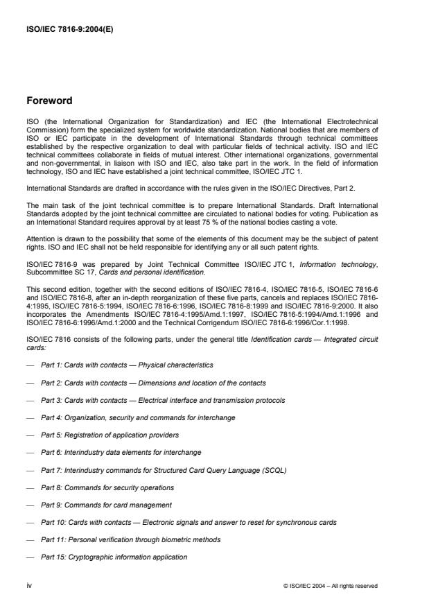 ISO/IEC 7816-9:2004 has the following relationships with other standards: It is inter standard links to ISO/IEC 7816-9:2017, ISO/IEC 7816-6:1996/Cor 1:1998, ISO/IEC 7816-9:2000, ISO/IEC 7816-6:1996, ISO/IEC 7816-4:1995, ISO/IEC 7816-8:1999, ISO/IEC 7816-5:1994, ISO/IEC 7816-5:1994/Amd 1:1996, ISO/IEC 7816-4:1995/Amd 1:1997, ISO/IEC 7816-6:1996/Amd 1:2000. Understanding these relationships helps ensure you are using the most current and applicable version of the standard.