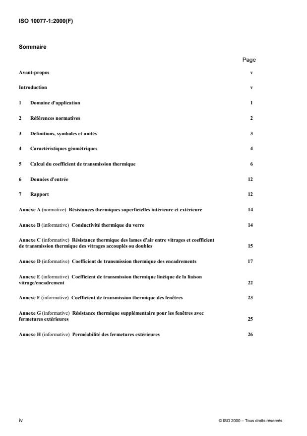 ISO 10077-1:2000 is a standard published by the International Organization for Standardization (ISO). Its full title is "Thermal performance of windows, doors and shutters — Calculation of thermal transmittance — Part 1: Simplified method". This standard covers: La présente norme spécifie des méthodes de calcul du coefficient de transmission thermique des fenêtres, ainsi que des portes constituées de panneaux vitrés ou opaques montés dans un cadre, avec ou sans fermetures extérieures. Elle prend en compte: - différents types de vitrages (en verre ou en plastique; simples ou multiples; avec ou sans revêtements peu émissifs; avec espaces intercalaires remplis d'air ou d'autres gaz) ; - divers types d'encadrements (en bois; en plastique; en métal avec ou sans coupure thermique; en métal avec connexions métalliques ponctuelles, ou toute combinaison de matériaux) ; - le cas échéant, la résistance thermique supplémentaire introduite par différents types de fermetures extérieures, en fonction de leur perméabilité à l'air. Les murs-rideaux et les vitrages structurels non montés dans un cadre sont exclus de la présente norme. Les fenêtres de toit en sont également exclues en raison de la complexité géométrique de leurs encadrements. Des valeurs par défaut pour les vitrages, encadrements et fermetures sont données dans les annexes informatives. Les effets de pont thermique à la contrefeuillure ou au joint entre l'encadrement de fenêtre ou de porte et le reste de l'enveloppe du bâtiment sont exclus du calcul. Le calcul n'inclut pas: - les effets du rayonnement solaire - les transferts thermiques dus aux infiltrations d'air - le calcul des condensations ; - la ventilation des lames d'air dans les fenêtres doubles et couplées.