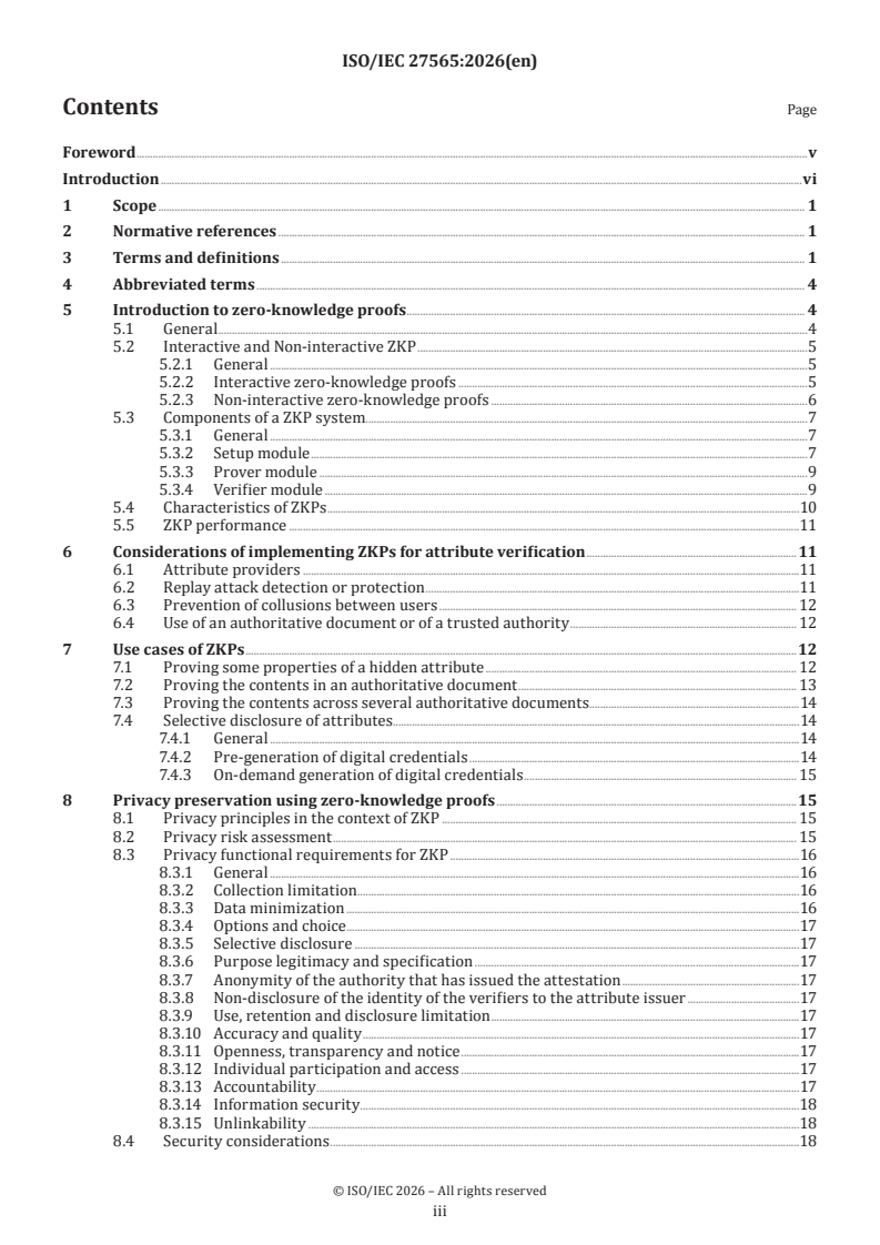 ISO/IEC 27565:2026 is a standard published by the International Organization for Standardization (ISO). Its full title is "Information security, cybersecurity and privacy protection — Guidelines on privacy preservation based on zero-knowledge proofs". This standard covers: This document provides guidelines on using zero-knowledge proofs (ZKP) to improve privacy by reducing the risks associated with the sharing or transmission of personal data between organizations and users by minimizing unnecessary information disclosure. It includes several ZKP functional requirements relevant to a range of different business use cases, then describes how different ZKP models can be used to meet those functional requirements securely.