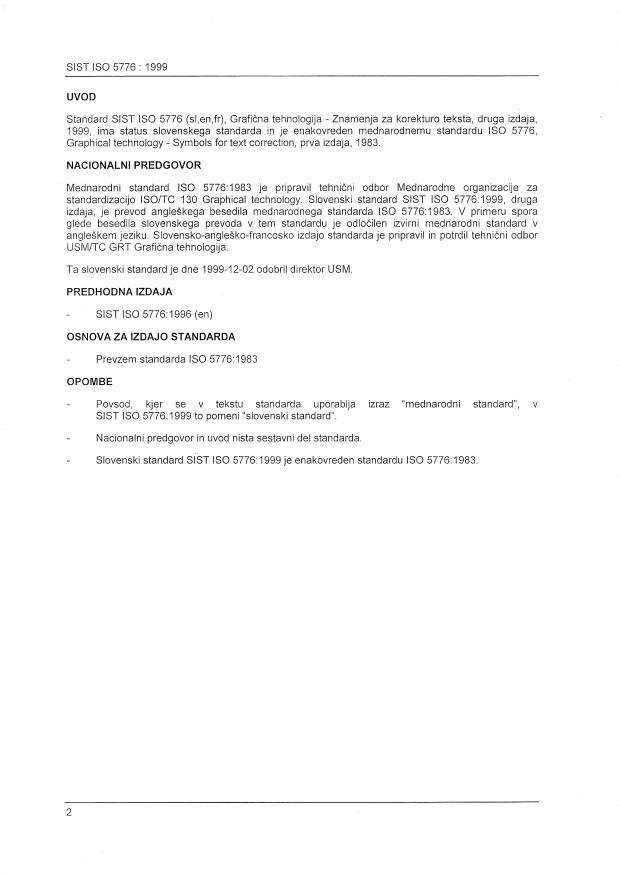 ISO 5776:1983 is a standard published by the International Organization for Standardization (ISO). Its full title is "Graphic technology — Symbols for text correction". This standard covers: Specifies symbols for proofreading such as of manuscripts, typescripts and printer's proofs. Does not apply to symbols of graphic art such as used in photo-engraving plants. Symbols for the correction of mathematical texts and colours illustrations are excluded. The total number of symbols specified is 16, each in English, French and Russian.