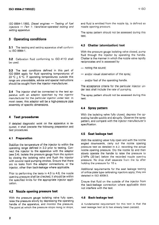 Keywords: ISO 8984-2:1993, diesel engines, fuel injector testing, nozzle opening pressure, chatter, spray pattern, seat leakage, back-leakage, hand-lever-operated testing.