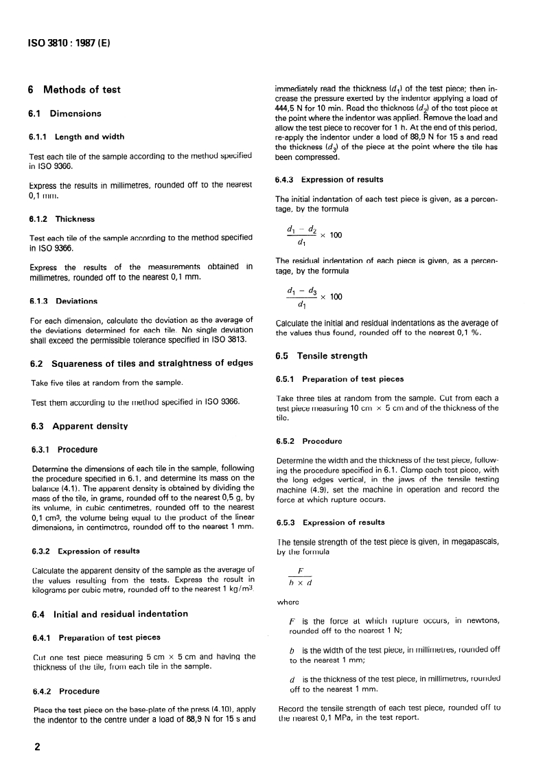 The following characteristics are determined: dimensions and squareness, apparent density, tensile strength, initial and residual indentation, ash content and resistance to boiling hydrochloric acid. Replaces the first edition of which this constitutes a technical revision.