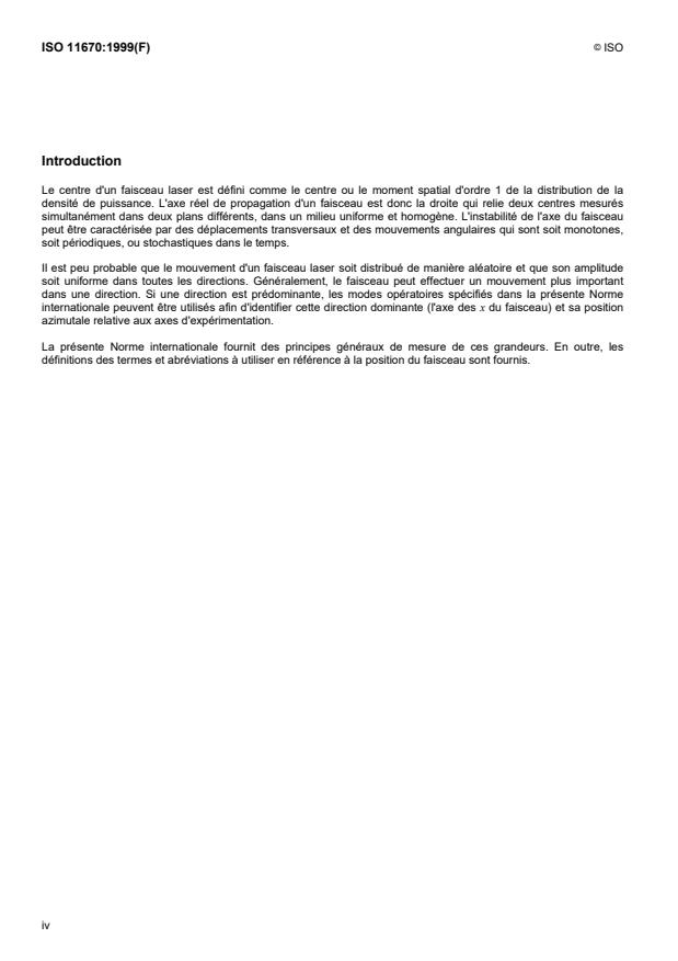 ISO 11670:1999 is a standard published by the International Organization for Standardization (ISO). Its full title is "Lasers and laser-related equipment — Test methods for laser beam parameters — Beam positional stability". This standard covers: La présente Norme internationale définit les méthodes de détermination de la stabilité de visée du faisceau. Les méthodes d'essai données dans la présente norme sont destinées à être utilisées pour l'essai et la caractérisation des lasers.