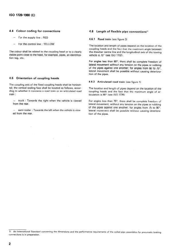 ISO 1728:1980 is a standard published by the International Organization for Standardization (ISO). Its full title is "Road vehicles — Pneumatic braking connections between motor vehicles and towed vehicles — Interchangeability". This standard covers: Specifies the requirements with concern to vehicle combinations equipped with pneumatic braking systems with two circuits: one control circuit and one pneumatic power circuit. Some figures illustrate shapes and reference quantities of concern. This second edition cancels and replaces the first edition (1975).