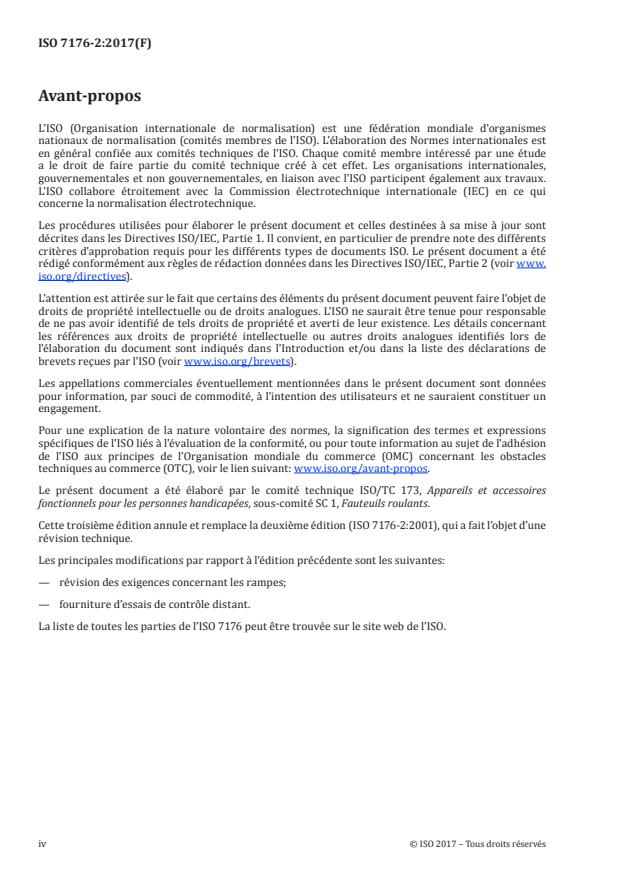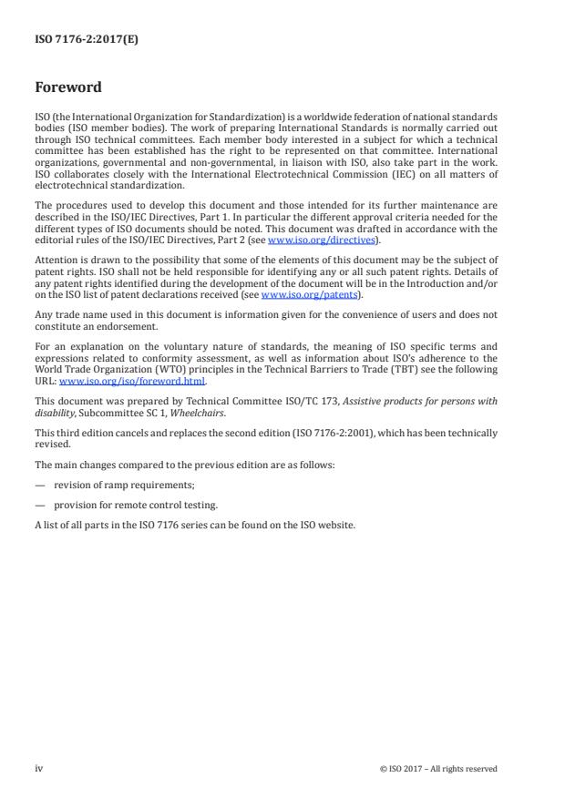 ISO 7176-2:2017 specifies test methods for determining the dynamic stability of electrically powered wheelchairs. ISO 7176-2:2017 is applicable to electrically powered wheelchairs, including scooters, with a maximum nominal speed not exceeding 15 km/h, intended to carry one person. ISO 7176-2:2017 is not applicable to manual wheelchairs with add-on power kits used for, or to assist, propulsion.