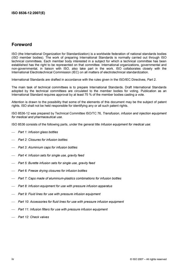 ISO 8536-12:2007 is a standard published by the International Organization for Standardization (ISO). Its full title is "Infusion equipment for medical use — Part 12: Check valves". This standard covers: ISO 8536-12:2007 applies to sterilized check valves intended for single use and used with infusion equipment for gravity-feed infusion and/or with pressure infusion apparatus.