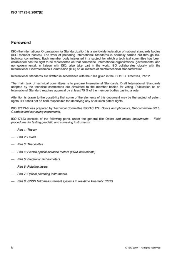 ISO 17123-8:2007 is a standard published by the International Organization for Standardization (ISO). Its full title is "Optics and optical instruments — Field procedures for testing geodetic and surveying instruments — Part 8: GNSS field measurement systems in real-time kinematic (RTK)". This standard covers: ISO 17123-8:2007 specifies field procedures to be adopted when determining and evaluating the precision (repeatability) of Global Navigation Satellite System (GNSS) field measurement systems (this includes GPS, GLONASS as well as the future systems like GALILEO) in real-time kinematic (GNSS RTK) and their ancillary equipment when used in building, surveying and industrial measurements. Primarily, these tests are intended to be field verifications of the suitability of a particular instrument for the required application at hand, and to satisfy the requirements of other standards. They are not proposed as tests for acceptance or performance evaluations that are more comprehensive in nature.