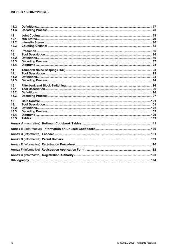 - Implementation notes: normative tables (e.g., Huffman codebooks), informative annexes on encoders, patents and registration procedures.