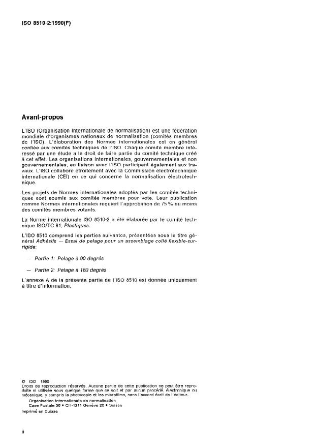 ISO 8510-2:1990 is a standard published by the International Organization for Standardization (ISO). Its full title is "Adhesives — Peel test for a flexible-bonded-to-rigid test specimen assembly — Part 2: 180 degree peel". This standard covers: Suitable for use with less flexible adherends. The principle consists in preparing a bonded assembly of two adherends, using the adhesive under test. The adherends are then pulled apart at a steady rate, starting at the open end of the bond, in such a way that separation occurs progressively along the length of the bonded adherends. The force is applied substantially parallel to the plane of the bond, through the separated part of the flexible adherend. A figure shows a schematic diagram.