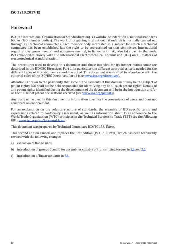 ISO 5210:2017 specifies the requirements for the attachment of multi-turn actuators to valves. Throughout this document, "actuator" may be understood as "actuator and/or gearbox" providing a multi-turn and/or linear output. ISO 5210:2017 specifies: - flange dimensions necessary for the attachment of actuators to industrial valves [see Figure 1 a)] or to intermediate supports [see Figure 1 b)]; - those driving component dimensions of actuators which are necessary to attach them to the driven components; - reference values for torque and thrust for flanges having the dimensions specified in this document.