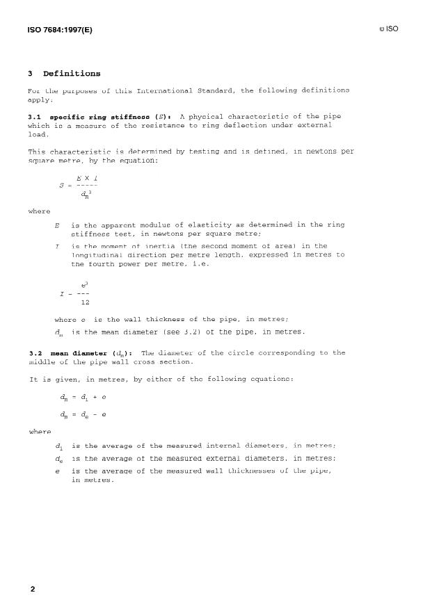 ISO 7684:1997 is a standard published by the International Organization for Standardization (ISO). Its full title is "Plastics piping systems — Glass-reinforced thermosetting plastics (GRP) pipes — Determination of the creep factor under dry conditions". This standard covers: Method for determining the dry creep factor of glass-reinforced plastics pipes. Applicable to pipes with an initial specific ring stiffness of not less than 630 N per square metres. Technically identical to EN 761:1994.