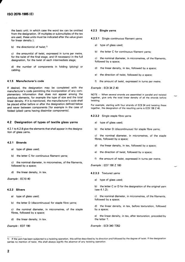 ISO 2078:1985 is a standard published by the International Organization for Standardization (ISO). Its full title is "Textile glass — Yarns — Designation". This standard covers: Textile glass — Yarns — Designation