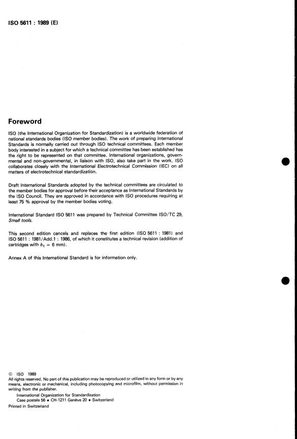 ISO 5611:1989 is a standard published by the International Organization for Standardization (ISO). Its full title is "Cartridges, type A, for indexable inserts — Dimensions". This standard covers: Cartridges, type A, for indexable inserts — Dimensions