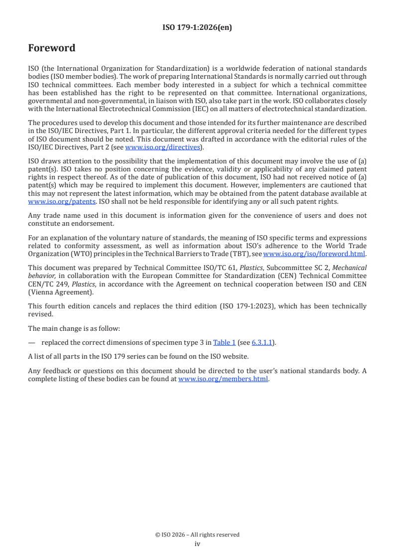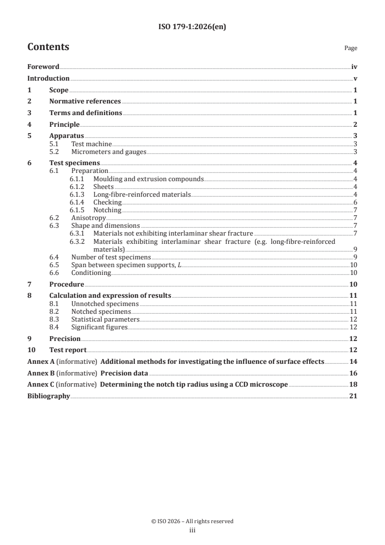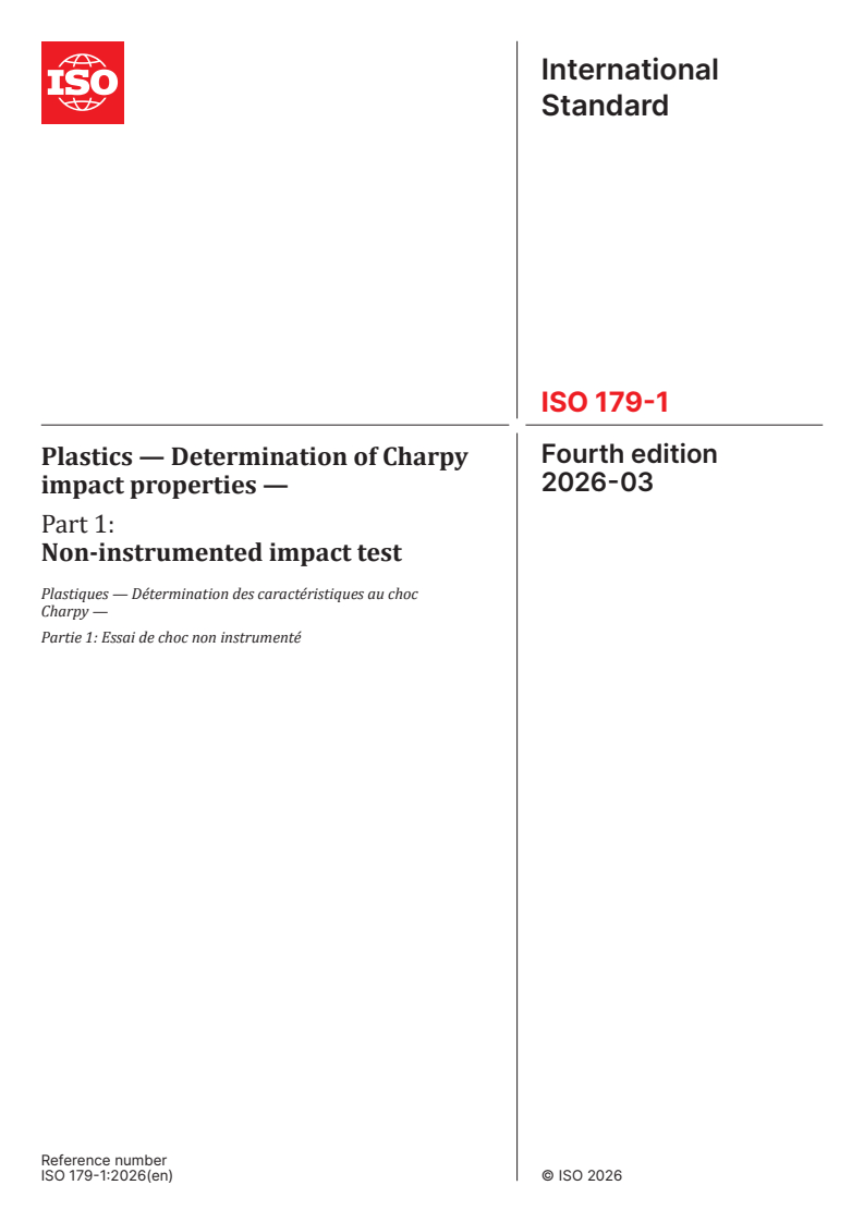 ISO 179-1:2026 is a standard published by the International Organization for Standardization (ISO). Its full title is "Plastics — Determination of Charpy impact properties — Part 1: Non-instrumented impact test". This standard covers: This document specifies a method for determining the Charpy impact strength of plastics under defined conditions. It defines a number of different types of specimen and test configurations. It also specifies different test parameters according to the type of material, the type of test specimen and the type of notch. The method described in this document can be used to investigate the behaviour of specified types of specimen under the impact conditions defined and for estimating the brittleness or toughness of specimens within the limitations inherent in the test conditions. It can also be used for the determination of comparative data from similar types of material.
