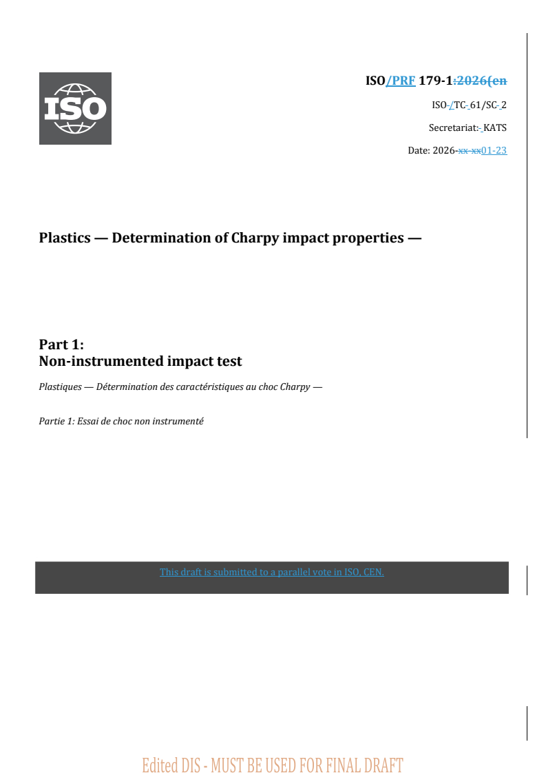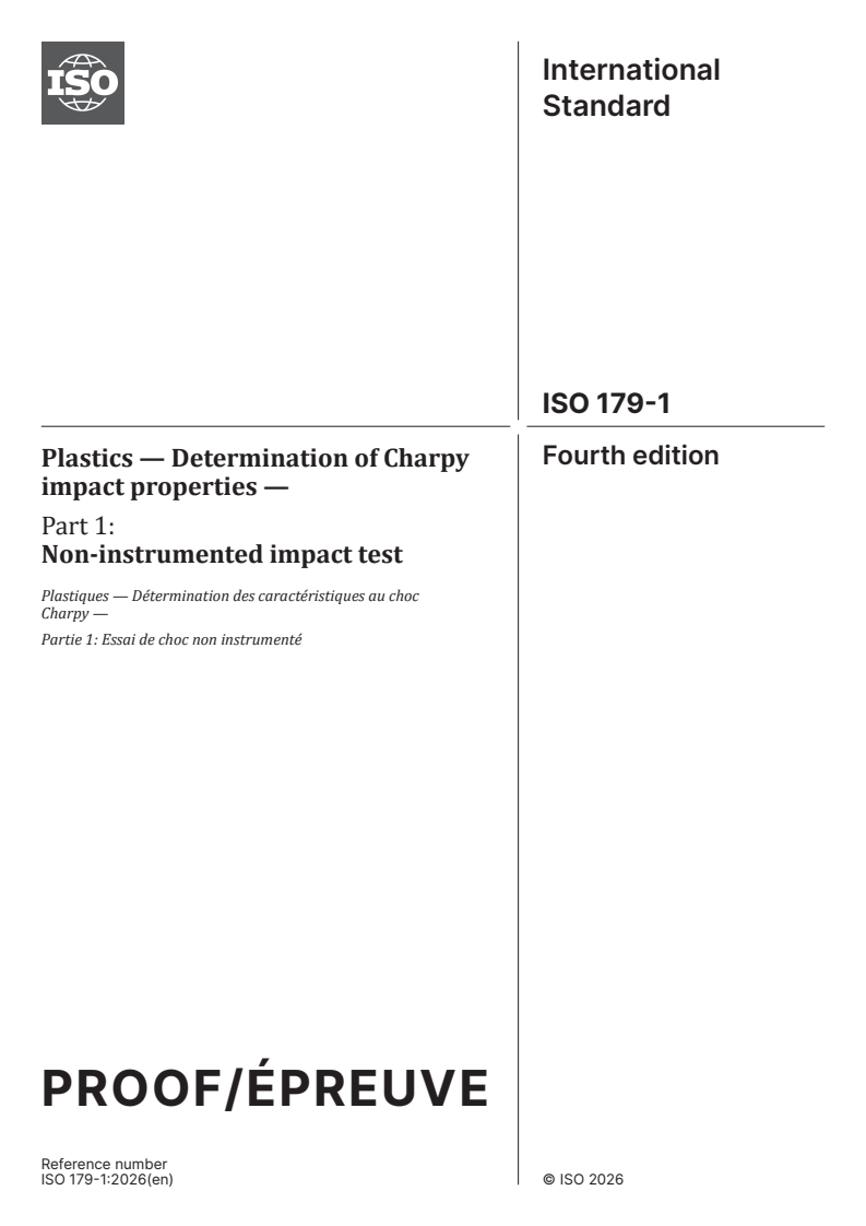 ISO/PRF 179-1 - Plastics — Determination of Charpy impact properties — Part 1: Non-instrumented impact test Released:23. 01. 2026