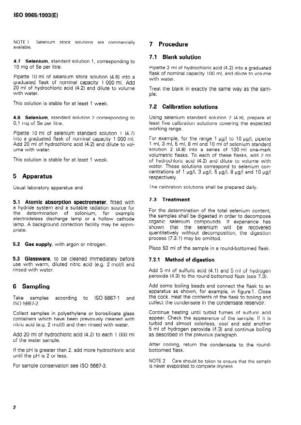 ISO 9965:1993 is a standard published by the International Organization for Standardization (ISO). Its full title is "Water quality — Determination of selenium — Atomic absorption spectrometric method (hydride technique)". This standard covers: Under the conditions of the method specified (thermal decomposition of selenium hydride for AAS), only Se(IV) is quantitatively converted to the hydride. To avoid errors in determination, other oxidation states need to be converted to Se(IV) prior to the determination. The absorbance is measured at a wavelength of 196,0 nm. The method determines selenium and organically bonded selenium in drinking waters, ground waters and surface waters, in a concentration range of 1 µg/l and 10 µg/l. Higher concentrations can be determined by a suitable dilution of the water sample.