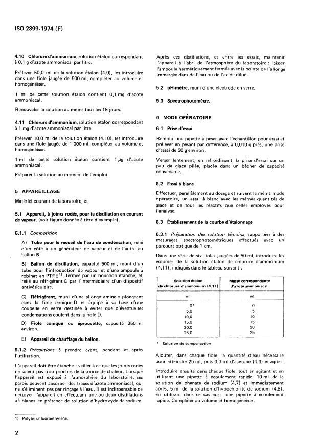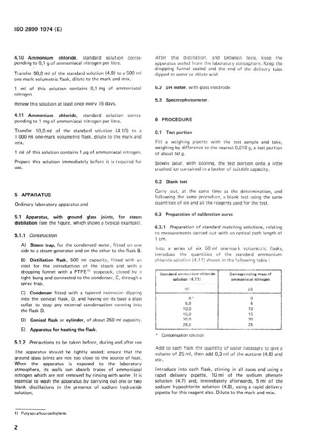 ISO 2899:1974 is a standard published by the International Organization for Standardization (ISO). Its full title is "Sulphuric acid and oleums for industrial use — Determination of ammoniacal nitrogen content — Spectrophotometric method". This standard covers: Applicable to products having contents of more than 0.0001 % (m/m). The procedure described is suitable for contents between 0.0001 % (m/m) and 0.0005 % (m/m). It bases on distillation, with entrainment by steam, of the ammonia in the presence of an excess of sodium hydroxide and collection of the distillate in an excess of acid solution. Neutralization of the dexcess of acid and formation of the coloured complex by treatment with sodium phenate and sodium hypochlorite in the presence of acetone. Spectrophotometric measurement of the indophenol obtained at a wavelength of about 630 nm. Has also been approved by the IUPAC.