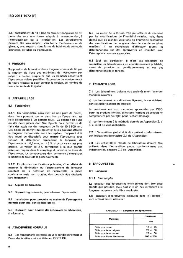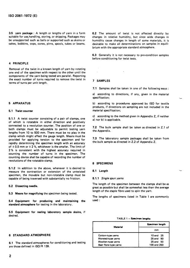 ISO 2061:1972 is a standard published by the International Organization for Standardization (ISO). Its full title is "Textiles — Determination of twist in yarns — Direct counting method". This standard covers: Textiles — Determination of twist in yarns — Direct counting method