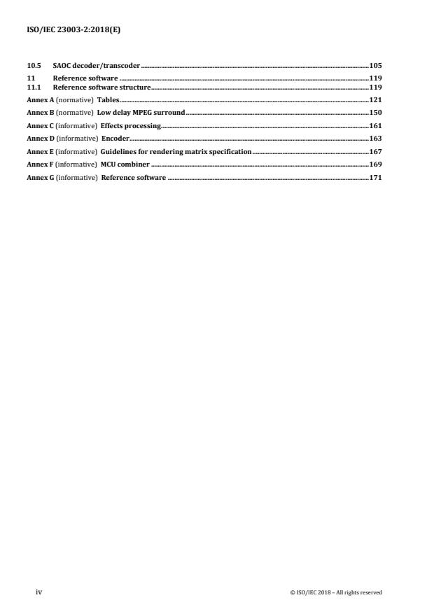 - Ancillary features - Effects processing, MCU combiner, low‑power and low‑delay modes are described; normative tables and annexes provide implementation guidance.