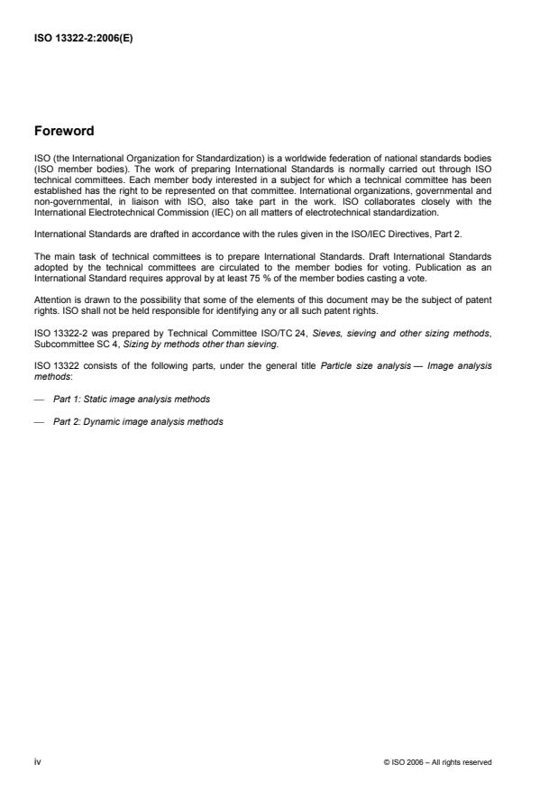 ISO 13322-2:2006 is a standard published by the International Organization for Standardization (ISO). Its full title is "Particle size analysis — Image analysis methods — Part 2: Dynamic image analysis methods". This standard covers: ISO 13322-2:2006 describes methods for controlling the position of moving particles in a liquid or gas and on a conveyor, as well as the image capture and image analysis of the particles. These methods are used to measure the particle sizes and their distributions, the particles being appropriately dispersed in the liquid or gas medium or on the conveyor. The practical limitations of the derived particle size are addressed when using ISO 13322-2:2006.