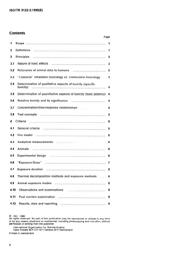 ISO/TR 9122-2:1990 is a technical report published by the International Organization for Standardization (ISO). Its full title is "Toxicity testing of fire effluents — Part 2: Guidelines for biological assays to determine the acute inhalation toxicity of fire effluents (basic principles, criteria and methodology)". This standard covers: This Technical Report provides basic background information on methods suitable to define the acute inhalation toxicity of fire effluents, as generated by fire models. Contains terms and definitions.
