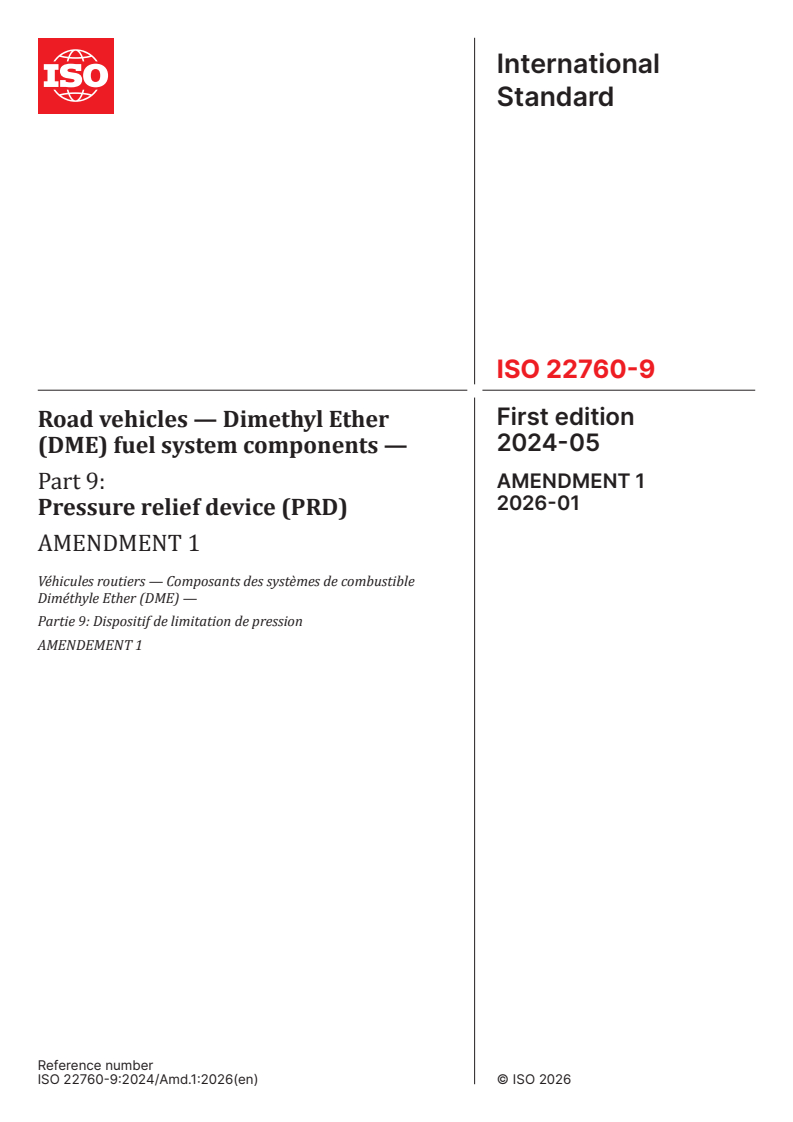ISO 22760-9:2024/Amd 1:2026 is a standard published by the International Organization for Standardization (ISO). Its full title is "Road vehicles — Dimethyl Ether (DME) fuel system components — Part 9: Pressure relief device (PRD) — Amendment 1". This standard covers: Road vehicles — Dimethyl Ether (DME) fuel system components — Part 9: Pressure relief device (PRD) — Amendment 1