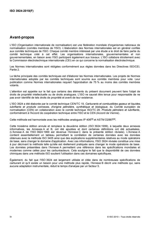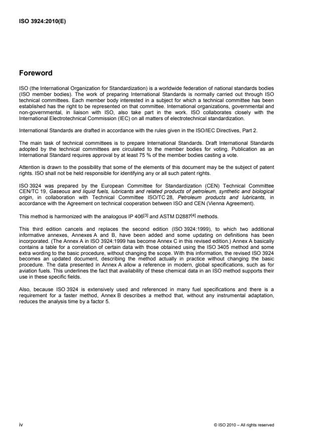ISO 3924:2010 specifies a method for the determination of the boiling-range distribution of petroleum products. The method is applicable to petroleum products and fractions with a final boiling point of 538 °C or lower at atmospheric pressure as determined by this International Standard. ISO 3924:2010 is not applicable to gasoline samples or gasoline components. The method is limited to products having a boiling range greater than 55 °C and having a vapour pressure sufficiently low to permit sampling at ambient temperature. ISO 3924:2010 has successfully been applied to samples containing biodiesel up to 10 %.