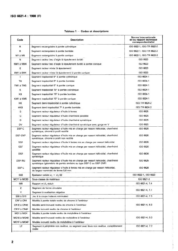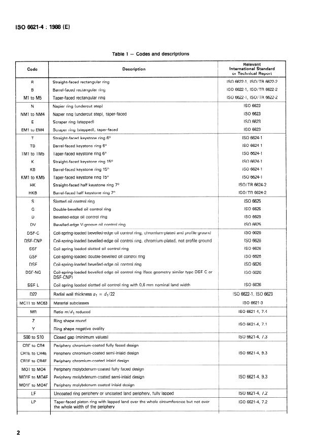 ISO 6621-4:1988 is a standard published by the International Organization for Standardization (ISO). Its full title is "Internal combustion engines — Piston rings — Part 4: General specifications". This standard covers: This part lays down the general characteristics of piston rings, individual dimensional criteria of which are specified as appropriate in the ISO publications cited in clause 0. Provides a system for coding, designation and marking of the piston rings. Applies to all rings up to and including 200 mm diameter covered by the above classification for both reciprocating internal combustion piston engines and compressors.