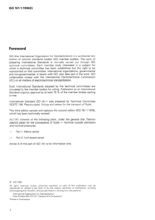 ISO 161-1:1996 - Thermoplastics pipes for the conveyance of fluids -- Nominal outside diameters and nominal pressures