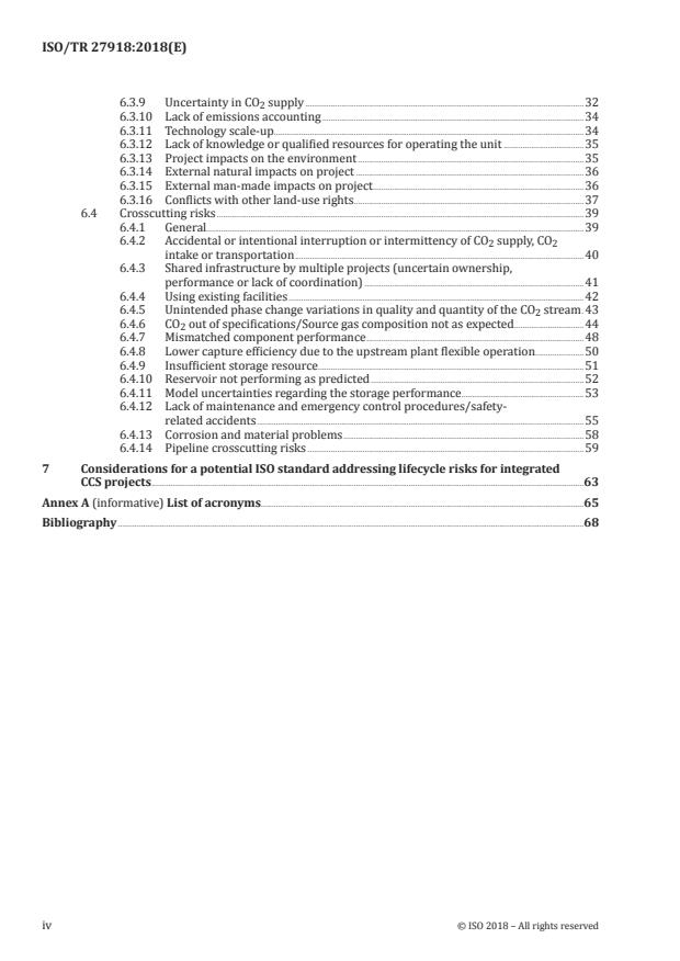 ISO/TR 27918:2018 is designed to be an information resource for the potential future development of a standard for overall risk management for CCS projects. The risks associated with any one stage of the CCS process (capture, transportation, or storage) are assumed to be covered by specific standard(s) within ISO/TC 265 and other national and/or international standards. For example, the risks associated with CO2 transport by pipelines are covered in ISO 27913. The scope of this document is intended to address more broadly applicable lifecycle risk management issues for integrated CCS projects. Specifically, the focus of this document is on risks that affect the overarching CCS project or risks that cut across capture, transportation, and storage affecting multiple stages. It needs to be noted that environmental risks, and risks to health and safety should be very low for CCS projects provided the project is carefully designed and executed. Risk identification and management is part of the due diligence process. A list of acronyms is included in Annex A. Clause 5 includes an analysis of how a CCS standard could address aspects of risk analysis that apply to all elements of the CCS chain, such as: - risk identification (identifying the source of risk, event, and target of impact)[1]; - risk evaluation and rating; - risk treatment; - risk management strategy and reporting. Clause 6 comprises an inventory of the overarching and crosscutting risks. These include issues such as: - environmental impact assessment; - risk communication and public engagement; - integration risks between capture, storage, and transportation operators, such as risk of non-conformance of CO2 stream to required specifications; - integration risks associated with shared infrastructure (hubs of sources, common pipelines, hubs of storage sites); - risks resulting from interruption or intermittency of CO2 supply and/or CO2 in-take; - risks associated with policy uncertainty; - incidental risks from activities related to the capture, transportation or storage processes without being specifically covered in the respective standards (e.g. management or disposal of water produced as a by-product of CO2 storage). Clause 7 describes implications and considerations for a potential standard on lifecycle risks for integrated CCS projects. [1]As defined in ISO 31000.