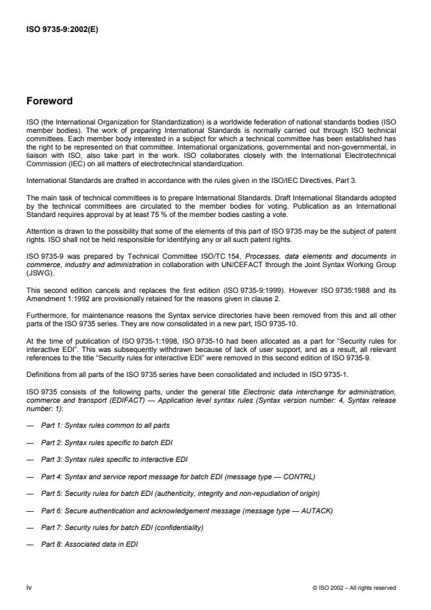 Foreword ISO (the International Organization for Standardization) is a worldwide federation of national standards bodies (ISO member bodies). The work of preparing International Standards is normally carried out through ISO technical committees. Each member body interested in a subject for which a technical committee has been established has the right to be represented on that committee. International organizations, governmental and non-governmental, in liaison with ISO, also take part in the work. ISO collaborates closely with the International Electrotechnical Commission (IEC) on all matters of electrotechnical standardization. International Standards are drafted in accordance with the rules given in the ISO/IEC Directives, Part 3. The main task of technical committees is to prepare International Standards. Draft International Standards adopted by the technical committees are circulated to the member bodies for voting. Publication as an International Standard requires approval by at least 75 % of the member bodies casting a vote. Attention is drawn to the possibility that some of the elements of this part of ISO 9735 may be the subject of patent rights. ISO shall not be held responsible for identifying any or all such patent rights. ISO 9735-9 was prepared by Technical Committee ISO/TC 154, Processes, data elements and documents in commerce, industry and administration in collaboration with UN/CEFACT through the Joint Syntax Working Group (JSWG). This second edition cancels and replaces the first edition (ISO 9735-9:1999). However ISO 9735:1988 and its Amendment 1:1992 are provisionally retained for the reasons given in clause 2. Furthermore, for maintenance reasons the Syntax service directories have been removed from this and all other parts of the ISO 9735 series. They are now consolidated in a new part, ISO 9735-10. At the time of publication of ISO 9735-1:1998, ISO 9735-10 had been allocated as a part for “Security rules for interactive EDI”. This was subsequently withdrawn because of lack of user support, and as a result, all relevant references to the title “Security rules for interactive EDI” were removed in this second edition of ISO 9735-9. Definitions from all parts of the ISO 9735 series have been consolidated and included in ISO 9735-1. ISO 9735 consists of the following parts, under the general title Electronic data interchange for administration, commerce and transport (EDIFACT) — Application level syntax rules (Syntax version number: 4, Syntax release number: 1): — Part 1: Syntax rules common to all parts — Part 2: Syntax rules specific to batch EDI — Part 3: Syntax rules specific to interactive EDI — Part 4: Syntax and service report message for batch EDI (message type — CONTRL) — Part 5: Security rules for batch EDI (authenticity, integrity and non-repudiation of origin) — Part 6: Secure authentication and acknowledgement message (message type — AUTACK) — Part 7: Security rules for batch EDI (confidentiality) — Part 8: Associated data in EDI