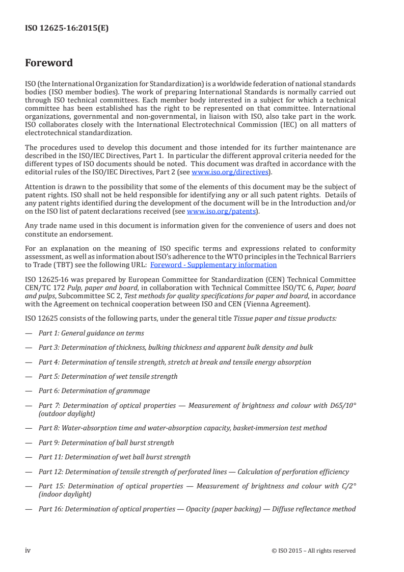 ISO 12625-16:2015 is a standard published by the International Organization for Standardization (ISO). Its full title is "Tissue paper and tissue products - Part 16: Determination of optical properties - Opacity (paper backing) - Diffuse reflectance method". This standard covers: ISO 12625-16:2015 specifies the testing procedures for the instrumental determination of the opacity of tissue paper or tissue products by diffuse reflectance using a paper backing. ISO 12625-16:2015 contains specific instructions for the preparation of test pieces of single-ply and multi-ply products, where special preparation/procedures might be necessary. It can be used to determine the opacity of tissue paper and tissue products containing fluorescent whitening agents, provided the UV content of the radiation incident on the test piece has been adjusted to conform to that in the CIE illuminant C using a fluorescent reference standard provided by an authorized laboratory as described in ISO 2470-1. ISO 12625-16:2015 is not applicable to coloured tissue paper and tissue products which incorporate fluorescent dyes or pigments.