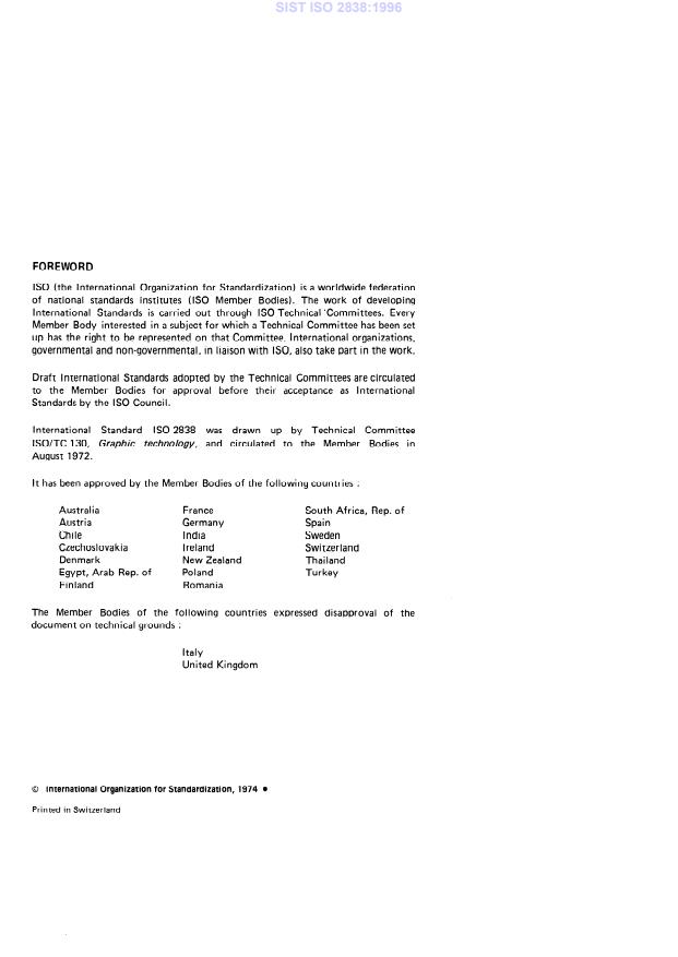 ISO (the International Organization for Standardization) is a worldwide federation of national Standards institutes (ISO Member Bodies). The work of developing International Standards is carried out through ISO Technical ‘Committees. Every Member Body interested in a subject for which a Technical Committee has been set up has the right to be represented on that Committee. International organizations, governmental and non-governmental, in liaison with ISO, also take part in the work. Draft International Standards adopted by the Technical Committees are circulated to the Member Bodies for approval before their acceptance as International Standards by the ISO Council. International Standard ISO 2838 was drawn up by Technical Committee lSO/TC 130, Graphit technology, and circulated to the Member Bodies in August 1972. lt has been approved by the Member Bodies of the following countries : Australia France Austria Germany Chile India Czechoslovakia I reland Denmark New Zealand Egypt, Arab Rep. of Poland Finland Romania South Africa, Rep. of Spain Sweden Swi tzerland Thailand Turkey The Member Bodies of the following countries expressed disapproval of the document on technical grounds : Italy United Kingdom 0 International Organkation for Standardkation, 1974 l Printed in Switzerland SIST ISO 2838:1996