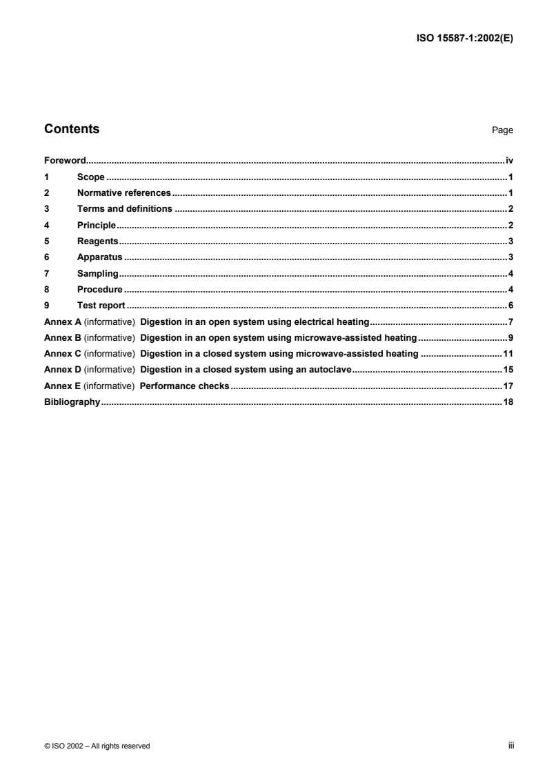 ISO 15587-1:2002 is a standard published by the International Organization for Standardization (ISO). Its full title is "Water quality - Digestion for the determination of selected elements in water - Part 1: Aqua regia digestion". This standard covers: This part of ISO 15587 specifies a method for extracting trace elements from a water sample using aqua regia as a digestion agent. The method is applicable to all types of waters with a suspended solids mass concentration of less than 20 g/l and a mass concentration of total organic carbon (TOC) expressed as carbon of less than 5 g/l. The aqua regia digestion method is empirical and it might not release elements completely. However, for most environmental applications, the result is fit for purpose. Aqua regia digestion is suitable for the release of: Ag, Al, As, B, Ba, Be, Ca, Cd, Co, Cr, Cu, Fe, Hg, K, Mg, Mn, Mo, Na, Ni, P, Pb, Sb, Se, Sn, Sr, Tl, V, Zn. It is not suitable for the digestion of refractory compounds such as SiO 2, TiO2 and Al2O3. The presence of chloride in the digestion solution may limit the application of analytical techniques. The method is generic and may be implemented using a wide variety of equipment provided the digestion composition is unchanged, the digestion temperature is known, and the digestion duration is in accordance with this temperature.