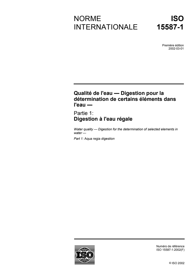 ISO 15587-1:2002 - Water quality — Digestion for the determination of selected elements in water — Part 1: Aqua regia digestion Released:2/28/2002