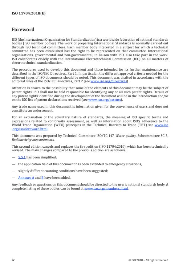 ISO 11704:2018 is a standard published by the International Organization for Standardization (ISO). Its full title is "Water quality — Gross alpha and gross beta activity — Test method using liquid scintillation counting". This standard covers: This document specifies a method for the determination of gross alpha and gross beta activity concentration for alpha- and beta-emitting radionuclides using liquid scintillation counting (LSC). The method is applicable to all types of waters with a dry residue of less than 5 g/l and when no correction for colour quenching is necessary. Gross alpha and gross beta activity measurement is not intended to give an absolute determination of the activity concentration of all alpha- and beta-emitting radionuclides in a test sample, but is a screening analysis to ensure particular reference levels of specific alpha and beta emitters have not been exceeded. This type of determination is also known as gross alpha and beta index. Gross alpha and beta analysis is not expected to be as accurate nor as precise as specific radionuclide analysis after radiochemical separations. The method covers non-volatile radionuclides below 80 °C, since some gaseous or volatile radionuclides (e.g. radon and radioiodine) can be lost during the source preparation. The method is applicable to test samples of drinking water, rain water, surface and ground water as well as cooling water, industrial water, domestic and industrial waste water after proper sampling and test sample preparation (filtration when necessary and taking into account the amount of dissolved material in the water). The method described in this document is applicable in the event of an emergency situation, because the results can be obtained in less than 4 h by directly measuring water test samples without any treatment. It is the laboratory's responsibility to ensure the suitability of this test method for the water samples tested.