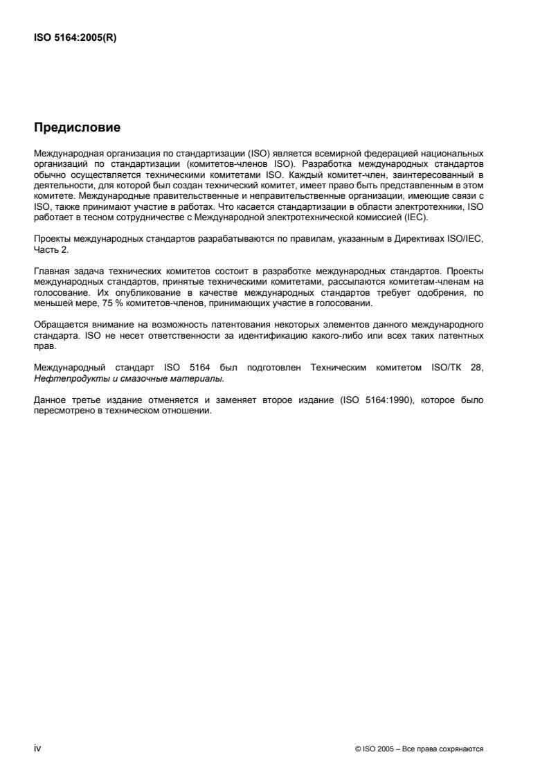 ISO 5164:2005 is a standard published by the International Organization for Standardization (ISO). Its full title is "Petroleum products — Determination of knock characteristics of motor fuels — Research method". This standard covers: ISO 5164:2005 establishes the rating of liquid spark-ignition engine fuel in terms of an arbitrary scale of octane numbers using a standard single cylinder, four-stroke cycle, variable compression ratio, carburetted, CFR engine operated at constant speed. Research octane number (RON) provides a measure of the knock characteristics of motor fuels in automotive engines under mild conditions of operation. T ISO 5164:2005 is applicable for the entire scale range from 0 RON to 120 RON, but the working range is 40 RON to 120 RON. Typical motor fuel testing is in the range of 88 RON to 101 RON. ISO 5164:2005 can be used for oxygenate-containing fuels containing up to 4,0 % (m/m) oxygen.