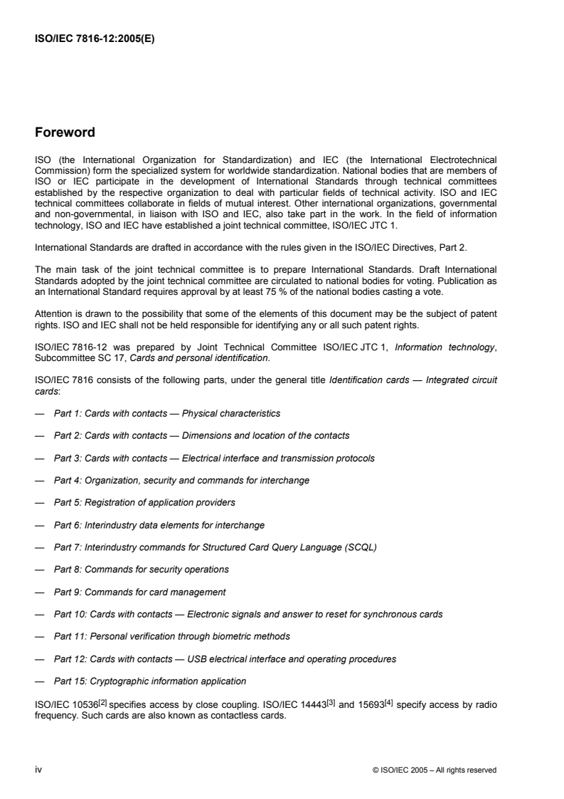 ISO/IEC 7816-12:2005 is a standard published by the International Organization for Standardization (ISO). Its full title is "Identification cards - Integrated circuit cards - Part 12: Cards with contacts - USB electrical interface and operating procedures". This standard covers: ISO/IEC 7816-12:2005 specifies the operating conditions of an integrated circuit card that provides a USB interface. An integrated circuit card with a USB interface is named USB-ICC. ISO/IEC 7816-12:2005 specifies the electrical conditions when a USB-ICC is operated by an interface device - for those contact fields that are not used, when the USB interface is applied; the USB standard descriptors and the USB-ICC class specific descriptor; the data transfer between host and USB-ICC using bulk transfers or control transfers; the control transfers which allow two different protocols named version A and version B; the (optional) interrupt transfers to indicate asynchronous events; status and error conditions. ISO/IEC 7816-12:2005 provides two protocols for control transfers. This is to support the protocol T=0 (version A) or to use the transfer on APDU level (version B). ISO/IEC 7816-12:2005 provides the state diagrams for the USB-ICC for each of the transfers (bulk transfers, control transfers version A and version B). Examples of possible sequences which the USB-ICC must be able to handle are given in an informative annex.