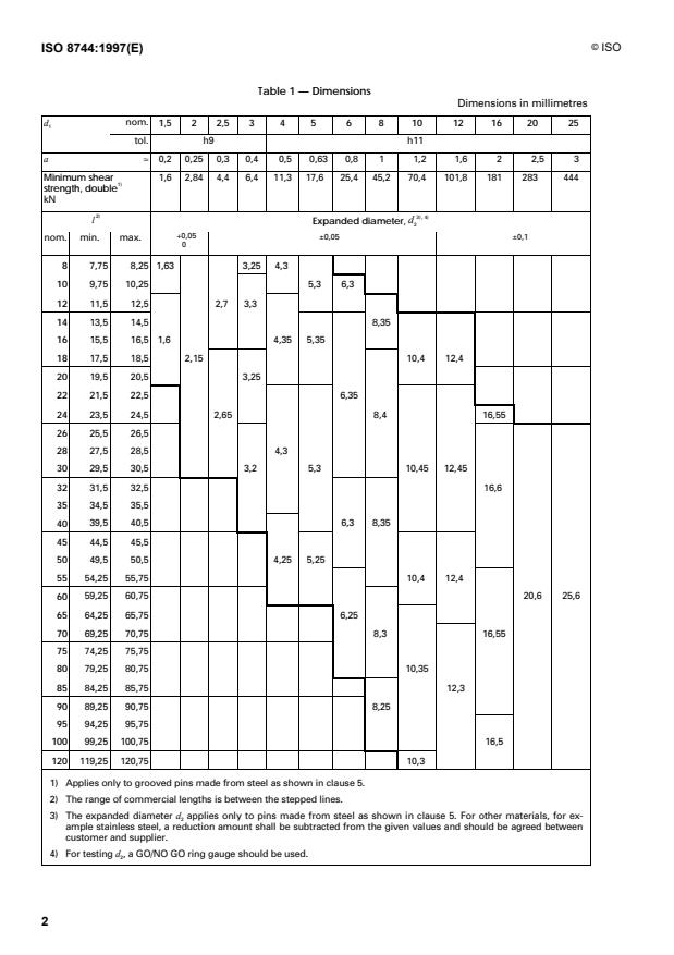 ISO 8744:1997 specifies the characteristics of full-length taper grooved pins - metallic fasteners with three equally spaced longitudinal grooves - intended for use as press-fit pins. The standard covers pins made of steel and austenitic stainless steel (grade A1) with nominal diameters from 1.5 mm to 25 mm. The displaced material at the grooves produces an expanded diameter that provides a non-positive locking fit when the pin is pressed into a drilled hole of nominal diameter (tolerance H11).