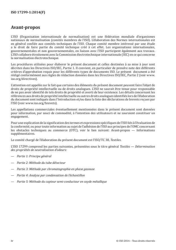 l'ISO 17299-1:2014 spécifie le principe général des produits textiles neutralisants d'odeurs ainsi que les méthodes d'essai des propriétés de neutralisation d'odeurs des produits textiles, tels que les tissus, les tricots, les nontissés, les fibres et fils, les produits tressés, les rubans et les élingues, etc.