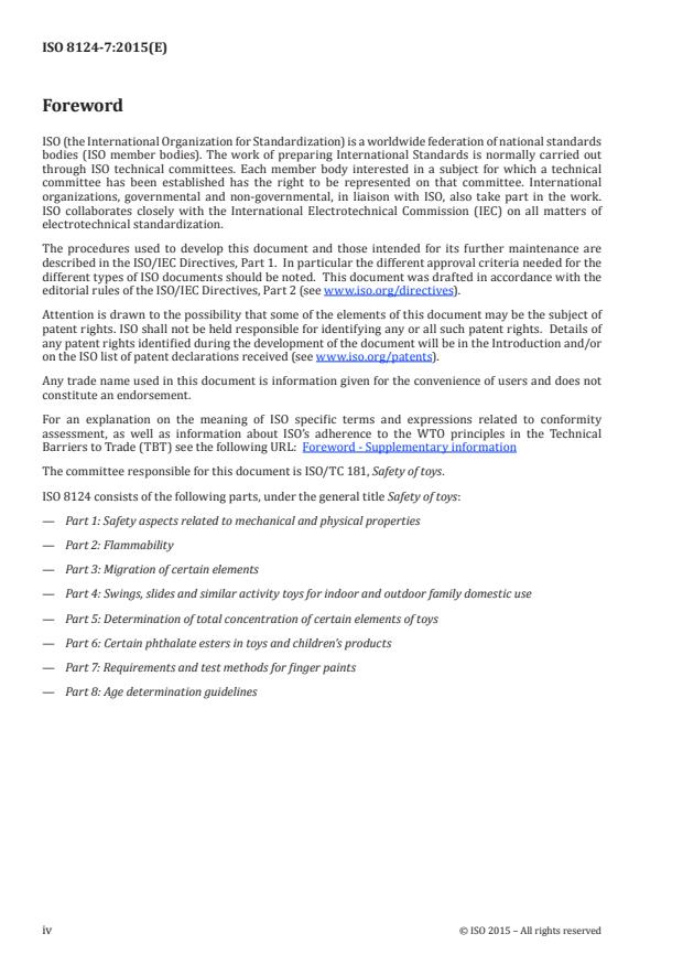 ISO 8124-7:2015 is a standard published by the International Organization for Standardization (ISO). Its full title is "Safety of toys - Part 7: Requirements and test methods for finger paints". This standard covers: ISO 8124-7:2015 specifies requirements for the substances and materials used in finger paints. It is applicable to finger paints only. It is not applicable to paints intended to be applied to the face or body e.g. face paints. Additional requirements are specified for markings, labelling and containers.