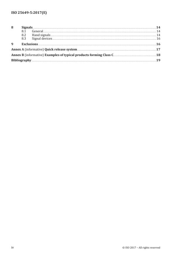 ISO 25649-5:2017 is a standard published by the International Organization for Standardization (ISO). Its full title is "Floating leisure articles for use on and in the water - Part 5: Additional specific safety requirements and test methods for Class C devices". This standard covers: ISO 25649-5:2017 is applicable for CLASS C classified floating leisure articles for use on and in water according to ISO 25649‑1 regardless of whether the buoyancy is achieved by inflation or inherent buoyant material. ISO 25649-5:2017 is to be applied with ISO 25649‑1 and ISO 25649‑2. NOTE 1 Typical products forming class C (see Annex B): - tube riders towable with interior holding facility and closed cockpit; - raft riders towable; - board riders towable; - banana type towable. NOTE 2 Typical places for application: - distant from bathing areas and other frequented water surfaces, wide empty spaces, dedicated racetracks (parcours); - no to little waves; - no strong currents.