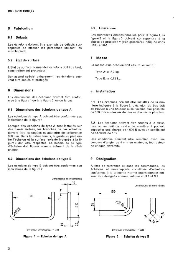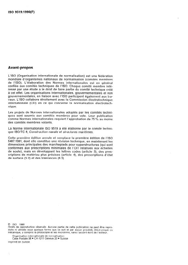 ISO 9519:1990 is a standard published by the International Organization for Standardization (ISO). Its full title is "Shipbuilding and marine structures — Rungs for dog-step ladders". This standard covers: La présente Norme internationale prescrit les types, les dimensions, le matériau, la fabrication et la désignation des échelons pour marchepieds; elle prescrit également le mode d'installation et la composition des différents échelons constituant le marchepied. Les marchepieds, formés d'échelons séparés soudés à la structure du navire, ne sont installés que lorsqu'il est impossible d'installer des échelles verticales fixes à montants. Les marchepieds ne doivent servir à relier que des points situés à une faible différence de hauteur. Les marchepieds spécifiés dans la présente Norme internationale peuvent aussi être installés sur des structures maritimes autres que des navires et à des fins identiques. NOTE 1 Les utilisateurs de la présente Norme internationale devront noter qu'ils auront également à respecter les éventuels règlements et prescriptions réglementaires applicables au type de navire ou de structure maritime considéré.