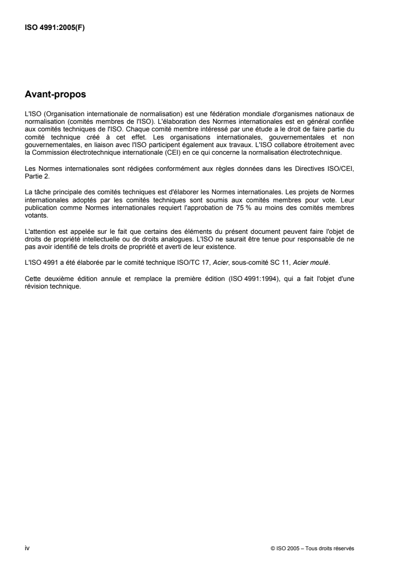 ISO 4991 was prepared by Technical Committee ISO/TC 17, Steel, Subcommittee SC 11, Steel castings.