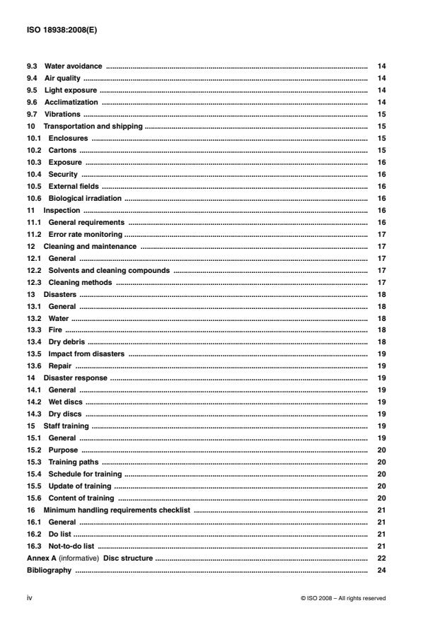 ISO 18938:2008 establishes general principles for the care and handling of digital optical discs during use. It addresses the issues of physical integrity of the medium necessary to preserve access to the recorded data (information). ISO 18938:2008 includes recommendations for handling procedures to maximize the effective life of optical discs. Faulty handling, packing and transporting techniques and methods often cause physical damage to the discs and to the content recorded thereon. Extending the longevity of optical discs requires the identification of appropriate handling methods, as well as well-developed and implemented training programs. For the purposes of ISO 18938:2008, the term “optical disc” includes the families of compact disc (CD), digital versatile disc (DVD), high definition digital versatile disc (HD DVD) and Blu-ray disc (BD), and any hybrids of these families. The term “optical disc” also includes each type of disc within a family, including injection moulded [read-only memory (ROM)], dye-layer [recordable (R)] and phase change [rewriteable (RW), random access memory (RAM)] technologies. While some of the recommendations in ISO 18938:2008 (e.g. those for staff training) apply specifically to large-scale or long term usage, the basics of all recommendations in ISO 18938:2008 are intended to be applied in circumstances where the desired result is long-term usage of the medium whether archival, commercial or personal. ISO 18938:2008 does not cover magneto-optical (MO) discs, laser discs (LD) or glass discs. At the time of writing, International Standards do not exist for HD DVD and Blu-ray discs. Nonetheless, it is believed that the recommendations in ISO 18938:2008 for care and handling can equally apply to them. It is recognized that some of these requirements are not necessarily possible for the individual user to achieve. The following are within the scope of ISO 18938:2008: use and handling environments, including pollutants, temperature and humidity and light exposure; contamination concerns; inspection; cleaning and maintenance, including cleaning methods and frequency; transportation; disasters, including water, fire, construction and post-disaster procedures; staff training.
